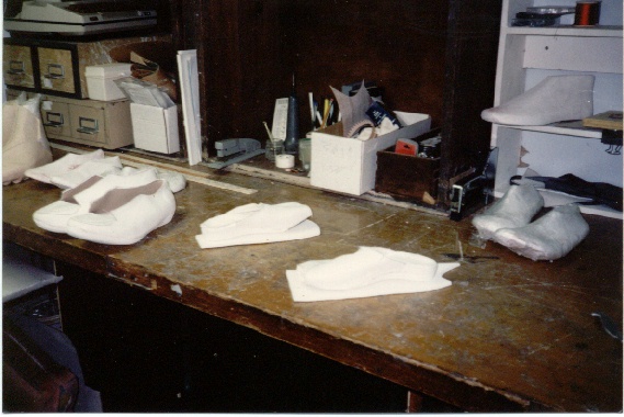 When making orthotics I make a plaster casting of the bottom of each foot. The prescription usually calls for the major joints of inversion and eversion, the subtalar and midtarsal joints to be held in their neutral positions as the plaster sets. A positive model is created over which an orthotic shell is formed. Graphite composites are now in vogue, but traditional leather laminates still give excellent results, and do not crack. The shell is positioned in the shoe, or posted, with a bottom layer of acrylic, rubber, or cork. Return to Home Page